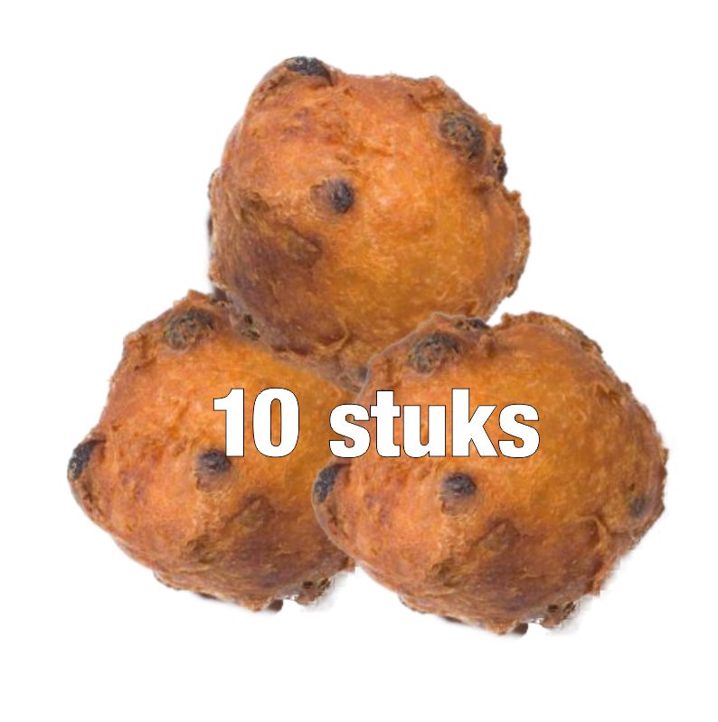 10 door ons zelf vers gebakken oliebollen (met rozijnen).Gemaakt met ingrediënten van Jumbo Hilkens Bunde.
